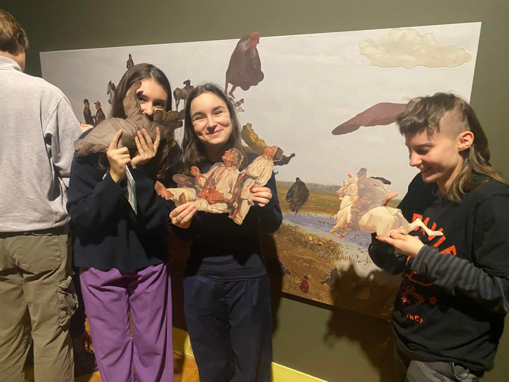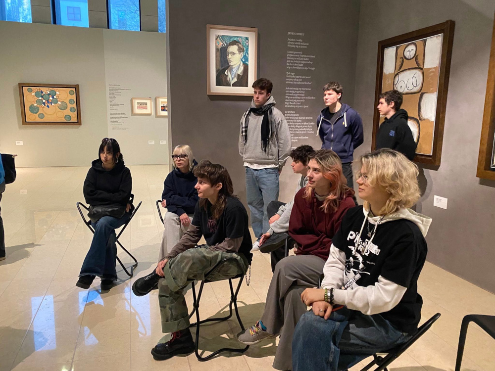 Lekcja polskiego w galerii fundacji rodziny Staraków na wystawie malarstwa Andrzeja Wróblewskiego. Luksusowo na krzesełkach.
