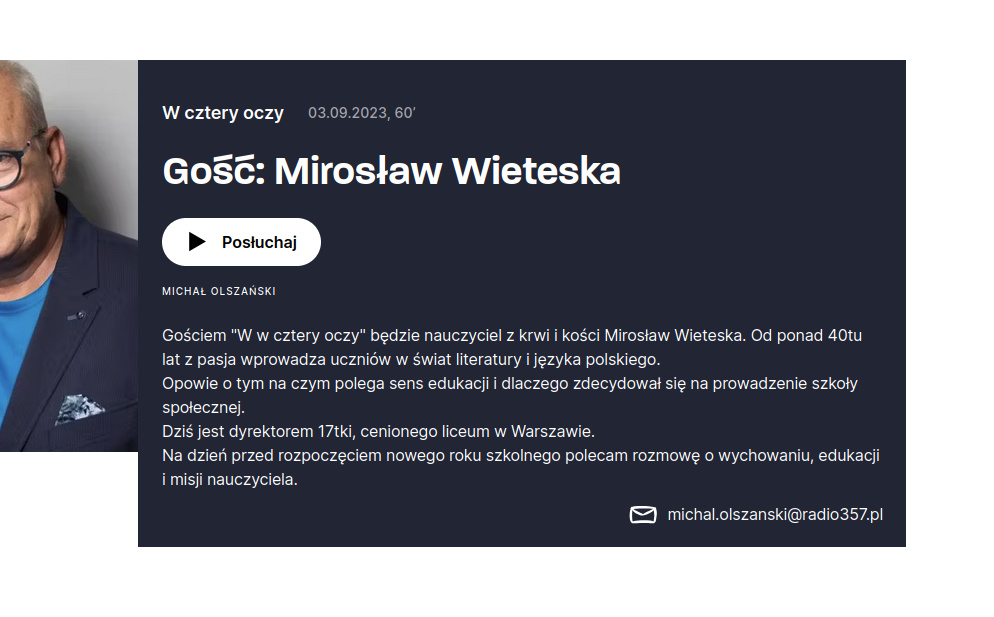 Uwaga, uwaga! Na antenie Radio357 można posłuchać Mirka Wieteski w audycji Michała Olszańskiego „W cztery oczy”. O czym Panowie rozmawiali? Niespodzianka! Jednak z pewnością również o szkole i o tym, że praca w niej to przede wszystkim wielka frajda.